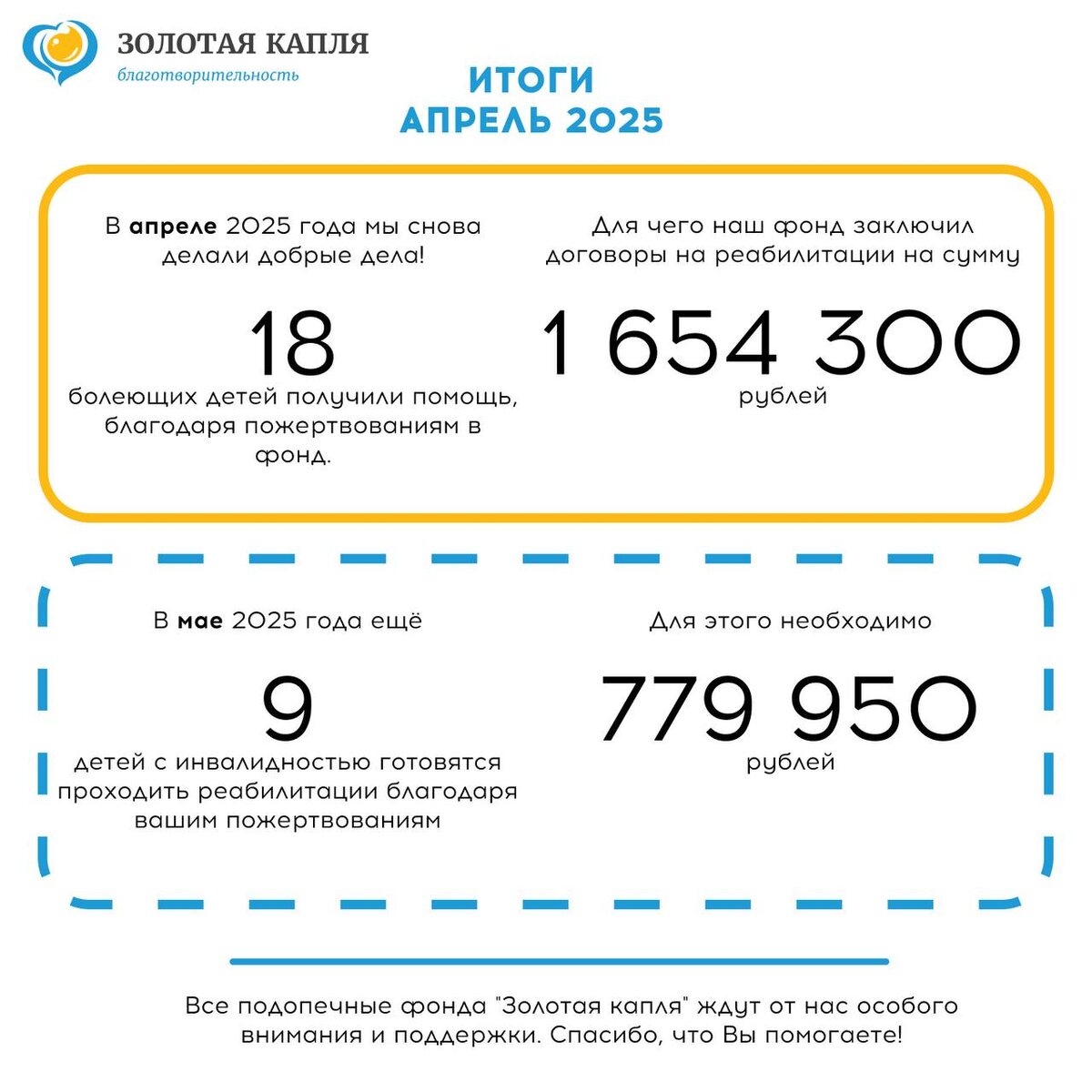 Здравствуйте!🎉 В апреле благодаря вашей поддержке 18 детей прошли важные курсы реабилитации! Для этого наш фонд заключил договоры на сумму 1 654 300 рублей. Но на этом мы не останавливаемся! В мае ещё 9 детей готовятся к реабилитации. Для этого необходимо собрать 779 950 рублей. Давайте вместе подарим им шанс на полноценную жизнь! 🔸Помочь просто с помощью кнопки в закрепленном сообщении канала Вместе легче! 🔹+7(937)-428-27-83 🔹fond@asiacement.ru 🔹золотая-капля.рф 🔹t.me/zolotaya_kaplya