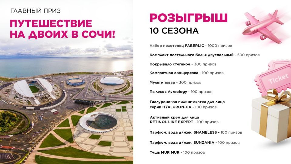 💎💎💎💎💎💎💎💎 Розыгрыш призов по итогам 10 сезона Faberlic Drive По итогам 10 сезона Faberlic Drive (5/25-8/25) вас ждет большой розыгрыш подарков! Выполняйте 100 баллов ЛО каждый период, участвуйте в активностях программы и накапливайте золотые драйвы! 1 золотой драйв = 100 драйвов. 😟Главный приз - путешествие на двоих в Сочи - Гиалуроновая пилинг-скатка для лица серии HYALURON-CA, арт. 12120 - 100 штук - Активный крем для лица RETINOL LIKE EXPERT, арт. 12042 – 100 штук - Парфюм. вода д/жен. SHAMELESS – 100 штук - Парфюм. вода д/жен. SUNZANIA, арт. 3106 – 100 штук - Тушь MUR MUR, арт. 56864 – 100 штук - Мультиповар – 300 штук - Пылесос Avreology – 100 штук - Набор полотенец FABERLIC - 1000 штук - Комплект постельного белья двуспальный - 500 штук - Покрывало стеганое – 300 штук -Компактная овощерезка - 100 штук