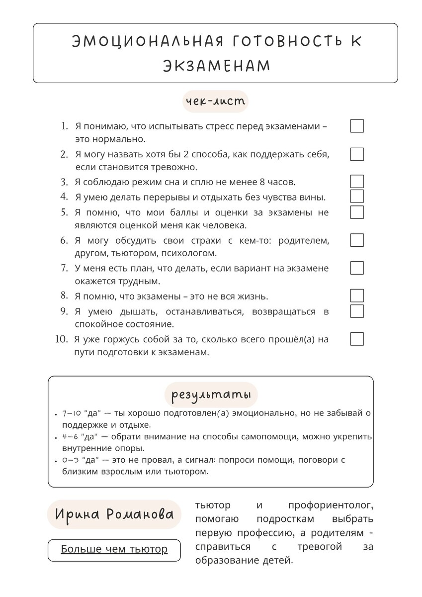 Перед экзаменами важно не только хорошо ориентироваться в учебном материале, но и уметь отслеживать свое состояние, а также справляться с тревогой и волнением. Подготовила для ваших подростков чек-лист эмоциональной готовности к экзаменам. Делитесь с теми, кому сейчас тревожно. Завтра пройдет поддерживающая встреча для тех, кто тяжело проживает стрессовый экзаменационный период. Сделаю вторую такую же встречу 27.05 в 16.00 по Москве. Для записи пишите мне. Больше чем тьютор | Ира Романова