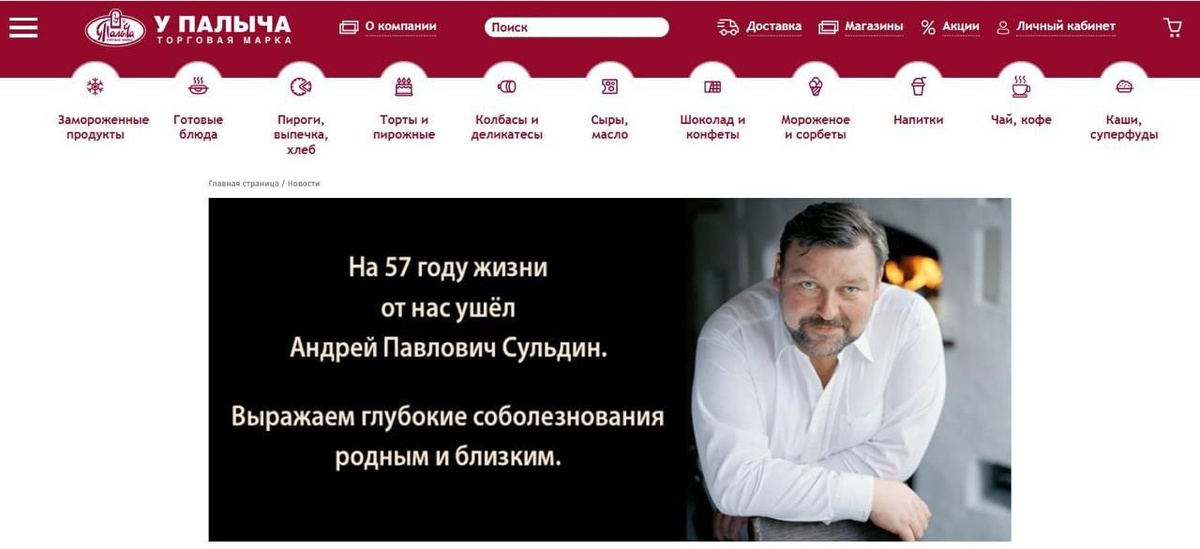 Умер основатель легендарного бренда «У Палыча» — Андрей Павлович Сульдин. Мужчине было всего 56 лет. Причина смерти ещё не установлена, но известно, что он страдал от диабета.