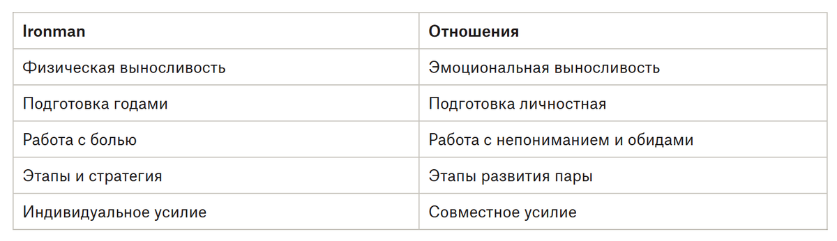 Так же, как Ironman требует подготовки, привычек, самопознания и стратегии, так и отношения требуют тех же навыков.
