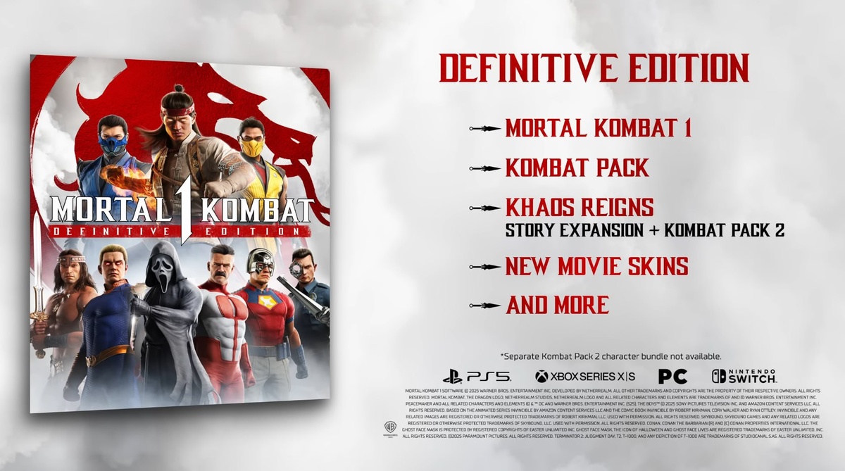 Вышла Mortal Kombat 1: Definitive Edition — полное издание файтинга с двумя абонементами на персонажей и сюжетным дополнением Khaos Reigns, а также в качестве бонуса новые скины по мотивам фильмов. Уже доступно на ПК, PS5, Xbox Series и Switch.
