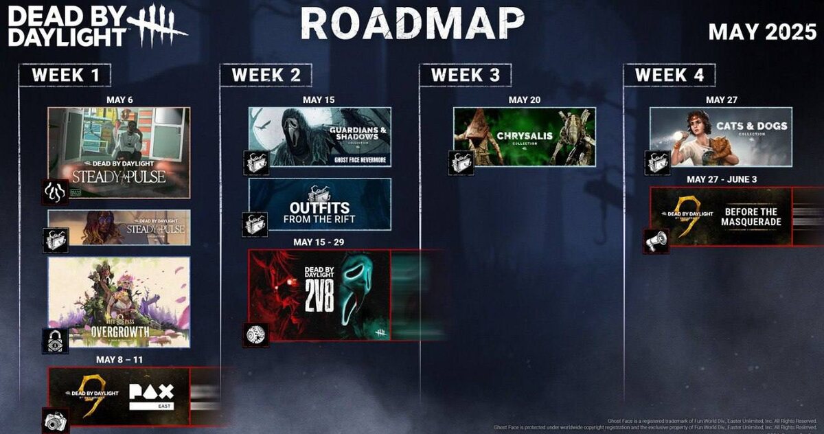❗️Новая Дорожная карта на май — С 15 по 29 мая вернется 2v8. Также в день начала события выйдет новая коллекция — 20 мая выйдет новая коллекция — 27 мая выйдет новая коллекция + начнется событие "Перед маскарадом", которое будет идти до 3 июня 🔪 Подписаться | 🗞 Предложка | 🚀 BOOST #deadbydaylight #дбд #dbd #roadmap