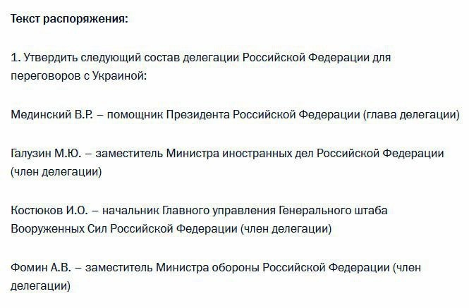 ⚡️Путин утвердил состав делегации России для переговоров с Украиной — Кремль.
