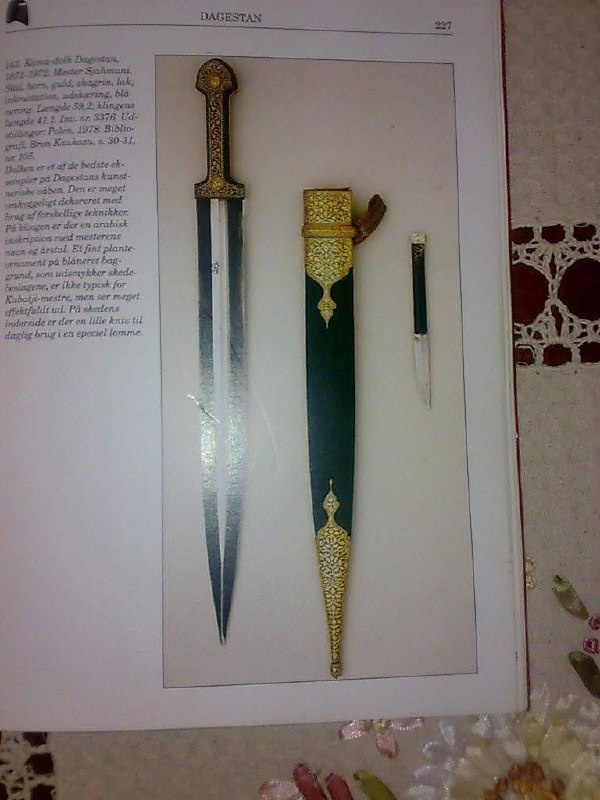 Къумукъ таварих Кинжал Шахманая из Гели В опубликованной в 1910 г. в Москве книге «О кустарной промышленности Закавказья» Г. Хелемский написал о двух «знаменитых мастерах прошлого» Абдулла-Агае и Шахманае Амир-Али-оглы, который работал главным оружейником у Абу-Муслим-Шамхала (ум. В 1860 г.). Э. Аствацатурова приводит, что многие клинки его работы превосходили по качеству даже базалаевские образцы. Свои изделия он подписывал арабской надписью «Работал Шахманай». В 1867 г. Шахманай лично представил на Всемирной выставке в Париже клинок шашки и дамский кинжал отделанный золотом.