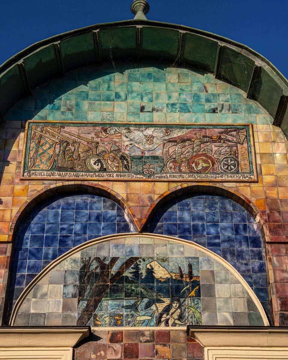 1️⃣ Дом купца Шаронова, ул. Фрунзе, 80. На мой взгляд - это один из самых красивых домов не только Таганрога, но и всей России, так как его фасад ярко украшен майоликой, изготовленной на Абрамцевском заводе.