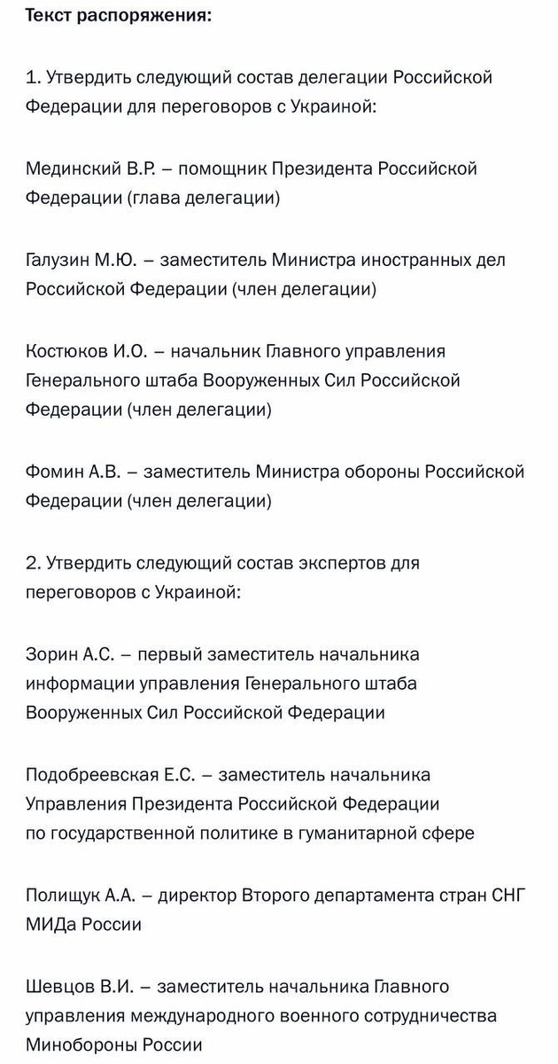 Владимир Путин подписал распоряжение о составе делегации Российской Федерации для переговоров с Украиной