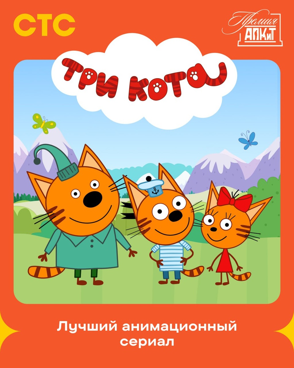 🏆 «Три Кота» шестой год подряд признан лучшим анимационным сериалом! Мультсериал «Три Кота» вновь подтверждает свой статус лучшего по версии XII премии Ассоциации продюсеров кино и телевидения! 13 мая состоялась церемония вручения премии АПКиТ, где проект «Три Кота» шестой год подряд был признан лучшим анимационным сериалом! Награда стала очередным подтверждением того, что хит СТС Анимации популярен и любим среди юных зрителей и их родителей, а Коржик, Карамелька и Компот завоевали сердца миллионов детей. В 2025 году «Три Кота» отмечают свой юбилей - уже 10 лет сериал радует своих зрителей, а с 11 декабря в кино выходит специальный выпуск, приуроченный к знаменательной дате. Анна Тарада, директор департамента анимации «СТС Медиа»: «Хочу поблагодарить уважаемое жюри АПКиТ (Ассоциации продюсеров кино и телевидения) за доверие и столь высокую оценку нашего проекта. 2025 год для нас очень важный. Именно в этом году проект «Три Кота» отмечает юбилей - 10-летие. В этом году мы подготовил