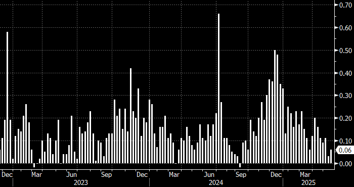 Однако благодаря эффекту очень низкой базы осталась в области минимумов текущего года. Потребительская инфляция в России в базисе неделя к неделе На неделе до 12 мая потребительская инфляция в России ускорилась до 0,06% н/н с 0,03% н/н (самое низкое значение с сентября), сообщает Росстат. С начала года накопленный показатель составил 3,28%. По оценке Минэкономразвития, показатель замедлился до 10,09% в годовом выражении с 10,21% неделей ранее. «За период с 6 по 12 мая 2025 г. цены изменились: на мясо кур +1,2%, свинину +0,5%, сыры твердые, полутвердые и мягкие, творог +0,3%, говядину, сосиски, сардельки, рыбу мороженую, муку и хлеб пшеничные, соль поваренную +0,2%, молоко пастеризованное, смеси сухие молочные для детского питания, маргарин, пшено, чай черный, печенье и обеды в столовой, кафе, закусочной (кроме столовой в организации) +0,1%», — говорится в отчете Росстата. —«Цены на плодоовощную продукцию в среднем снизились (-0,6%), в том числе на огурцы (-9,6%), помидоры (-5,9%) и бан