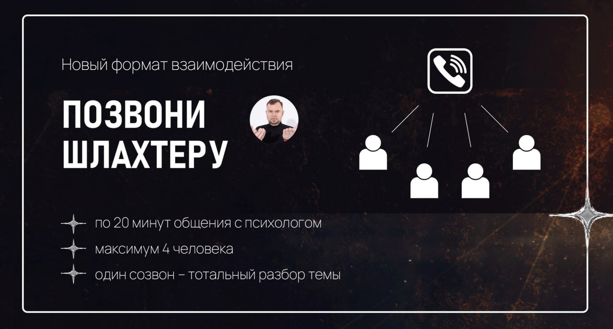 Позвони Шлахтеру – за один звонок ты узнаешь больше, чем за пару лет жизни. 🔴 Когда: 17 мая (суббота) 17:00 Тема созвона: «О сексе и тонкостях этого искусства». Формат: онлайн-созвон – 60 минут. Камеру включать не обязательно. Количество участников: максимум четыре человека. Что получит каждый: 20 минут живого общения с Вадимом Шлахтером. Кроме того, участники услышат вопросы друг друга и ответы Мастера. 💸 Стоимость: 5000₽. 📩 Пиши менеджеру: @schlachter_manager Возьму на созвон только первых четырех.