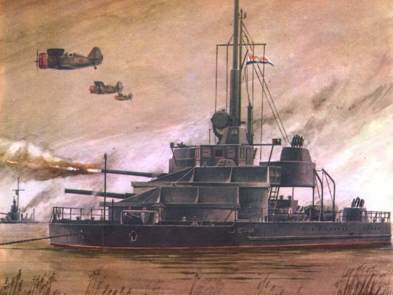 ... немецко-фашистское командование бросило против кораблей одновременно 22 самолета. Они заходили на бомбометание с разных направлений. Командир монитора «Ударный» капитан-лейтенант И. А. Прохоров, меняя скорость хода, всячески уклонялся от бомб, сыпавшихся с самолетов. Артиллеристы и пулеметчики создали стену заградительного огня. Они сбили один самолет, подбили второй. Стволы орудий и пулеметов раскалились.