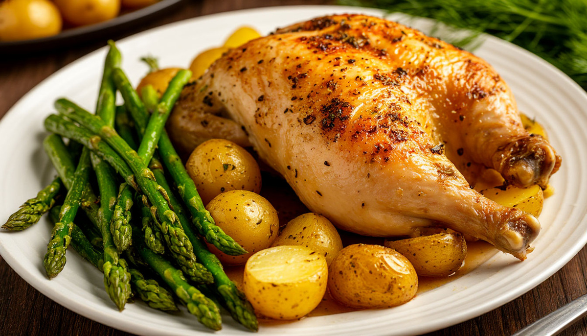 Запеченная курица с молодой картошкой и спаржей - идеальное майское блюдо, сочетающее в себе вкус молодой картошки, сочной курицы и нежной спаржи.