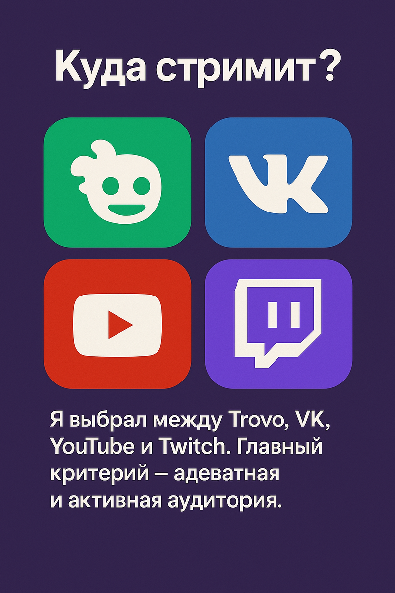 "Куда стримить?" — вопрос всех начинающих стримеров. Конечно, с аудиторией в 45 человек странно рассуждать о том, куда лучше стримить. Однако я уже определился с платформой и расскажу, почему выбрал именно её. Я выбирал между Трофо, ВК, YouTube и Twitch. Главный критерий — адекватная и активная аудитория. В результате я остановился на Twitch. Даже сегодня здесь самая большая аудитория в СНГ. Правила Twitch достаточно строгие: никто не может оскорблять других, так как за это легко получить бан. Ради эксперимента я провёл 10 часов в эфирах на ВК, Twitch и Трофо. Оказалось, что на Twitch было больше всего просмотров, активнее чат, да и в целом платформа интуитивно понятна и стримерам, и зрителям. Я продолжу стримить на Twitch, и если хочешь меня поддержать — переходи по ссылке в описании!