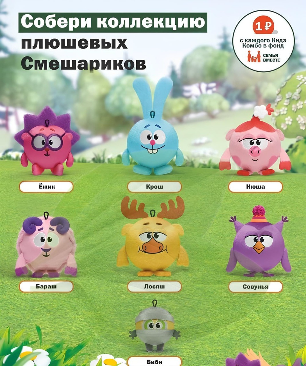 Вкусно — и точка запустит в продажу Смешариков. Мягкие игрушки с героями появятся в специальном Кидз Комбо уже в конце мая. На выбор — Крош, Лосяш, Бараш, Биби, Ёжик, Нюша и Совунья.