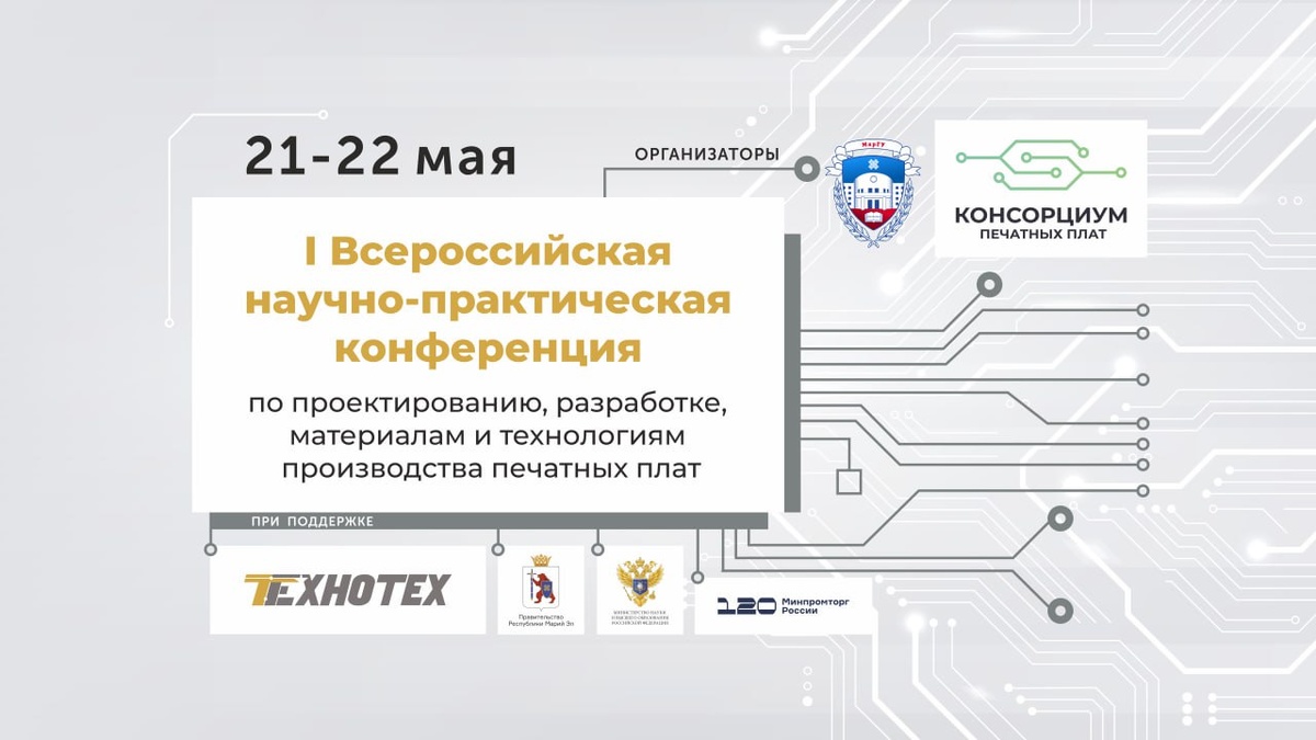 21-22 мая в Марийском государственном университете состоится I Всероссийская научно-практическая конференция по проектированию, разработке, материалам и технологиям производства печатных плат. Мероприятие объединит представителей науки и образования, федеральных и региональных органов власти, производителей и потребителей печатных плат, а также организации, занимающиеся развитием отечественных технологий. Организаторами конференции выступят АНО «Консорциум печатных плат» и МарГУ. Генеральный партнёр – ООО «Технотех» – ведущий российский производитель печатных плат с полувековым опытом работы. подробнее
