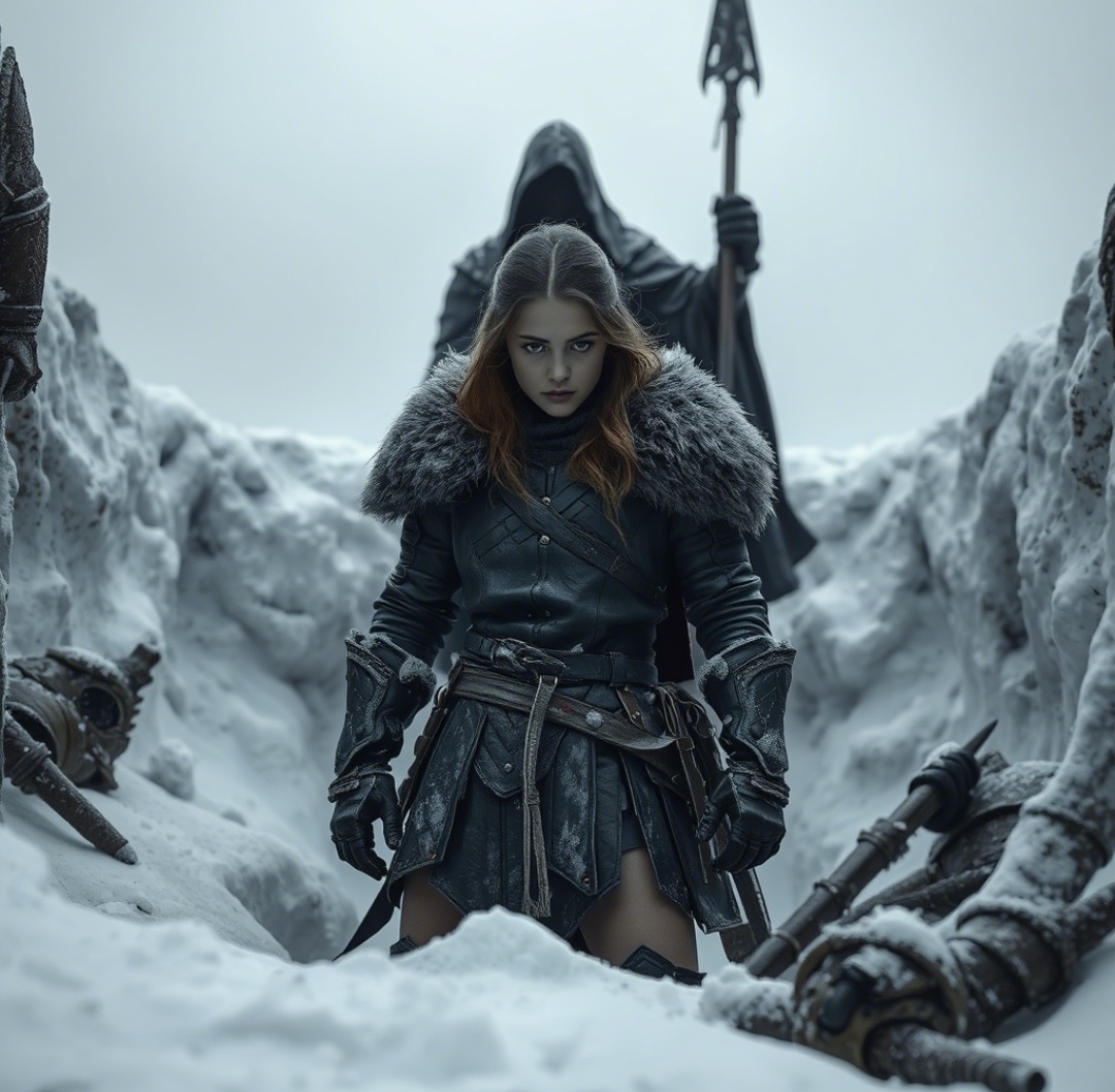 Эльда проснулась от запаха дыма. Её руки были связаны грубой верёвкой, ноги болели от холода. Вокруг — яма, вырытая в мерзлой земле. Тела наёмников лежали неподвижно, только снег медленно покрывал их лицо. Тенедар стоял у края, опираясь на копьё. — Ты долго спала, — сказал он, не глядя на неё. — Солнце уже склоняется. Эльда дернула верёвку. Она не собиралась умолять. — Почему я жива? Незнакомец бросил в яму свиток. Он приземлился рядом с её ногами. — Потому что ты должна прочесть это. Она молчала. Тенедар вздохнул и ушёл, оставив её одну. --- Ночь была ледяной. Эльда пыталась перекусить верёвку зубами, но кожа на щеках уже ободралась. В голове крутились слова Тора: «Не верь ему… Это он… убил твоего отца…». Отец умер в зале своего замка, убитый ядом в чаше с вином. Но кто отравил его? Враги? Свои? Или сам Тенедар? Эльда потянулась к нему, развернула. Печать её отца — знак, который она знала с детства...Она сжала бумагу в кулаке. — Ложь, — проше