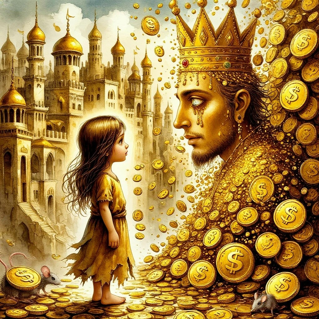 А в центре столицы стоял Храм Золотого Бога, где правил юный король Мидас Второй. Его волосы были из чистого золота, а глаза — холодные, как не отчеканенные монеты.