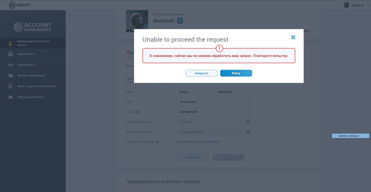 Всем привет, нашел стопроцентый вариант, так как сам долго разбирался решил помочь всем желающим все по пунктам распишу: 1) Арендуем на 1 день эстонский номер на 365SMS для подтверждения на юбисофт (примечание: именно арендуем а не берем на одну) (ссылка на сайт: https://365sms.pro/rent) 2) В юисофте нажимаем добавить номер и подтверждаем почту, добавляем номер С КОДОМ РЕГИОНА, то есть выбираете в окошке выбора страны эстонию (ЕЕ +372) и в окно для добавления номера пишем номер арендованный на 365SMS вместе с кодом региона, то есть в таком виде: (3725578508), после смотрим на сайте код обычно приходит быстро и вводим его. 3) После этого вылетает окно ошибки (прикреплю фото), нажимаем кнопку retry. 4) Заново подтверждаем код с почты, ОЧЕНЬ ВАЖНЫЙ МОМЕНТ КОД ПИШЕМ НОВЫЙ, а не тот что пришел в прошлый раз, потому что юбисфот странно работает и в этот момент может принять любой код, поэтому пишем именно новый код который прийдет на почту. 5) Заново выбираем код региона эстония (ЕЕ +372) и