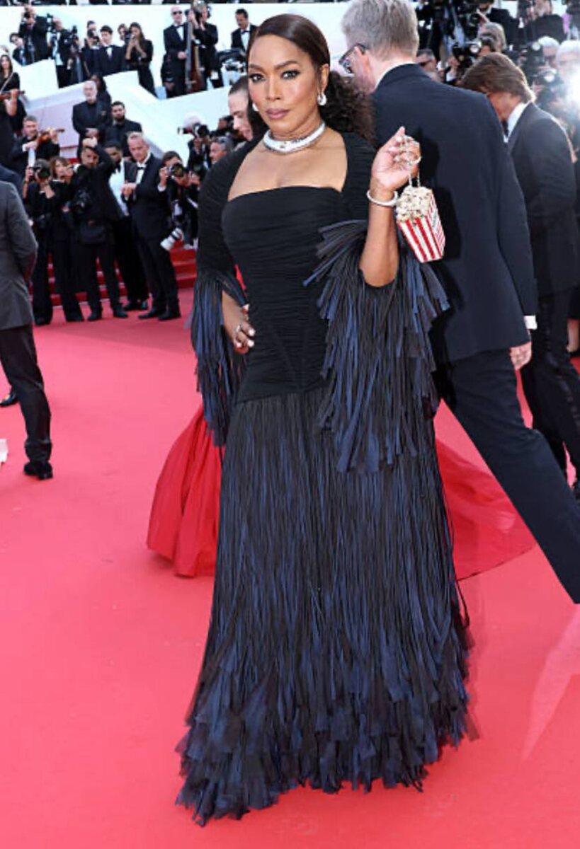 Анжела Бассетт с клатчем-пачкой поп-корна Judith Leiber и в платье Burberry