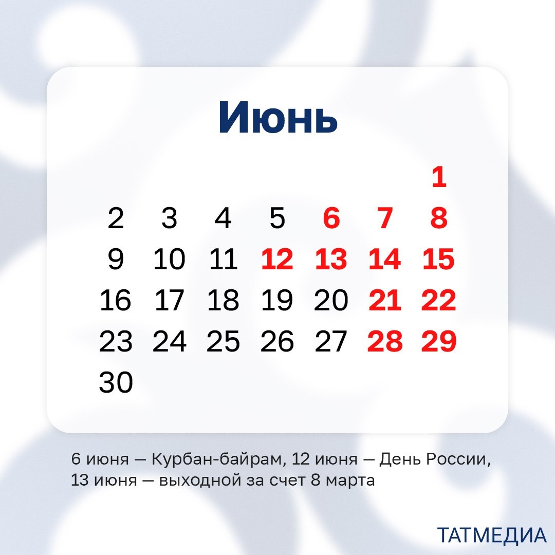 🥳📆 Татарстанцы в июне будут отдыхать 12 дней Первые длинные выходные продлятся три дня – с 6 по 8 июня. Это связано с праздником Курбан-байрам, который отмечается 6 июня. В связи с празднованием 12 июня Дня России и переносом выходного с 8 марта на 13 июня татарстанцы отдохнут четыре дня подряд – с 12 по 15 июня. Кроме того, выходными днями у работающих на пятидневке будут 1, 21, 22, 28 и 29 июня. @tatmediaofficial