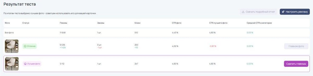 После теста получили – полный отчёт: CTR, клики, позиции, затраты и частотность по каждому фото и кластеру.