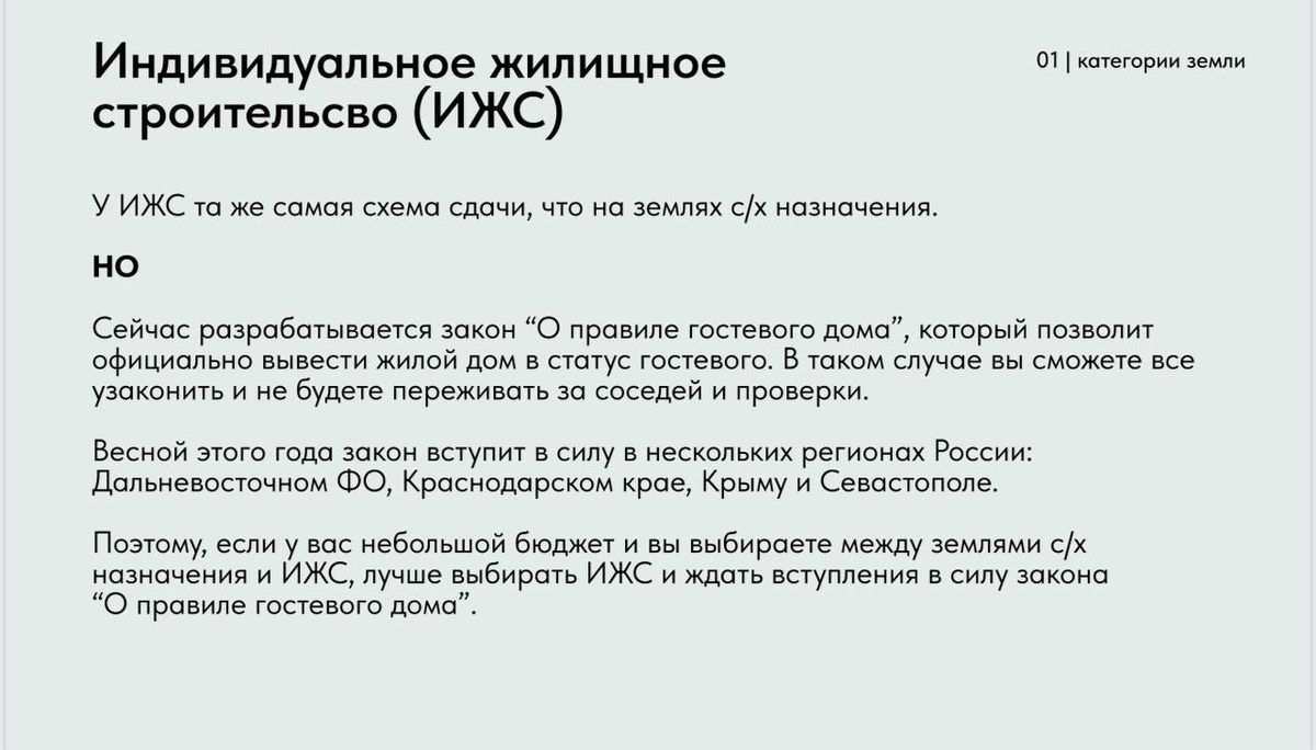 Совсем недавно мне прислали так называемый чек-лист для открытия базы отдыха 🫢 Говорят, что этот материал "учит" людей открыть свою базу отдыха, и что именно это продают авторы. 💬 Конечно, после такого поста мне наверняка напишут возмущенные сообщения, и, возможно, это будет не совсем корректно по отношению к коллегам, но я считаю, что образование — это не только передача знаний, но и ответственность перед обществом ☝🏻 Все мы стремимся к доходу, но он должен зарабатываться честно, а не на неопытности других людей. Если кратко, то по этому чек-листу создание базы отдыха выглядит как что-то невероятно простое: купили землю (лучше всего сельхозземли СХ2), ведь рекреация дорогая, размежевали участки и через дачную амнистию за несколько дней оформили дом. Строим чан, баню, и вот — база готова 🙌🏻 Про юридические основы бизнеса в этом списке вообще ничего не сказано. Зато есть явное указание — «строить на сельхозземле СХ2», то есть на участках, предназначенных для дачного отдыха и садов