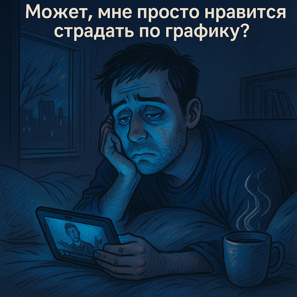 — Молчи, ты в прошлый раз тоже ныл, и ничего, справились. Ничто так не затягивает, как “одним глазком”. Через полчаса этот глаз — красный, усталый и норовит вывалиться в пустоту. Я лежу в кровати, лицо подсвечено синим.