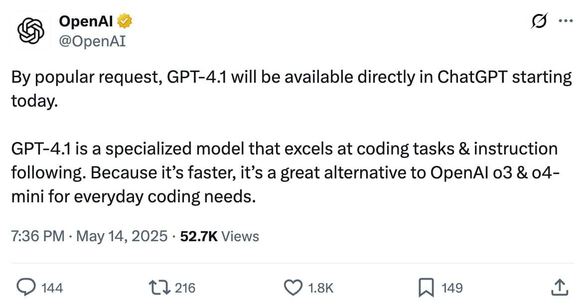 GPT-4.1 добавили в ChatGPT — это одна из лучших нейронок OpenAI для написания кода