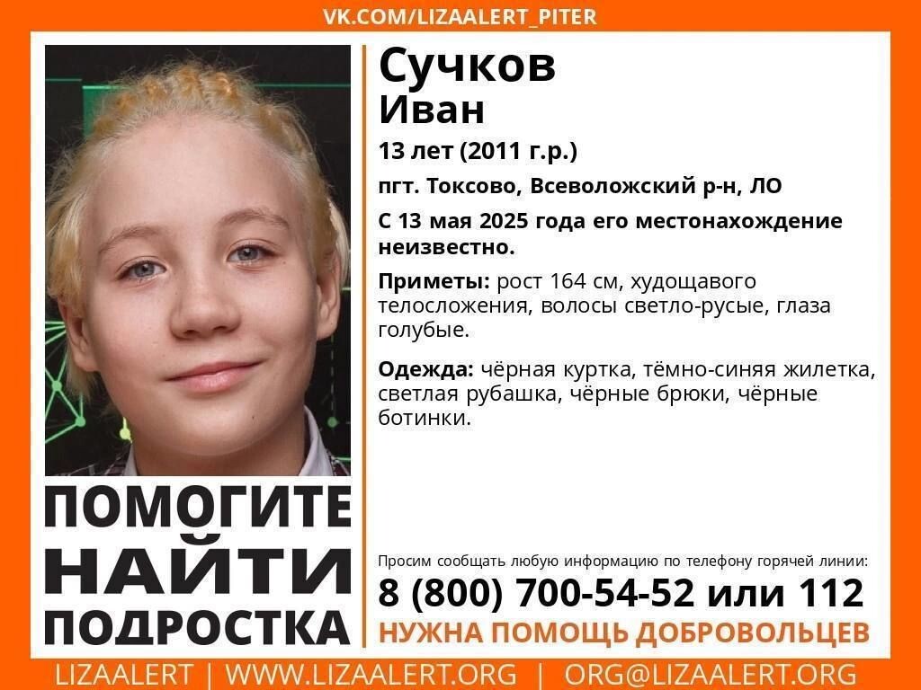 «Сучков Иван 2011 года рождения. С 13 мая 2025 года его местонахождение неизвестно. Просим сообщать любую информацию. Нужна помощь добровольцев», – сказано в сообщении.