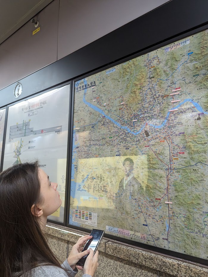 Метро в Корее. Часть 2 7. Транспортные карты нужно прикладывать на входе и на выходе. На входе списывается минимальная стоимость, а на выходе могут ещё что-то досписать, если поездка была дальней. Один раз я приложила карту на выходе, толкнула вперёд чемодан и турникет решил, что я уже прошла (там был не безбарьерный турникет, а обычные дверцы). И второй раз карту мою не принимал. А надо как-то выйти. Еле нашла какую-то сотрудницу через несколько минут. Она не понимала по-английски, и просто открыла мне служебный проход без лишних вопросов. Вот тебе снова среда доверия. 8. Навигация — адский винегрет. ⠀ С одной стороны — супер-подробно: карты в 2D и 3D, схемы вагонов и дверей, нумерация на потолках, на полу, на стенах, музыка при приближении поезда… ⠀ А с другой — перебор, от которого уже ничего не понятно. Голова кругом, а нужная информация всё равно теряется. И вот иногда теряешься потому что информации слишком много, а иногда информации наоборот нет! Так мы однажды не смогли на