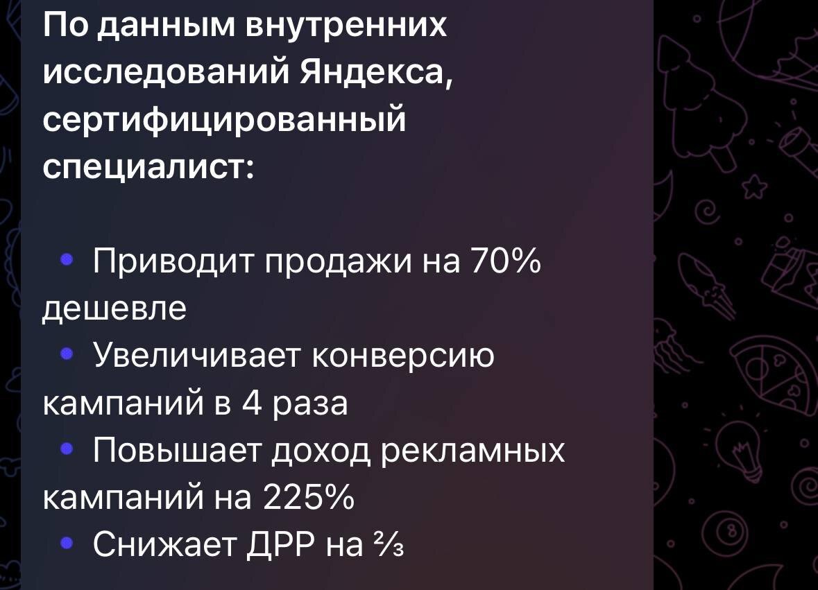 ↗️ Найми сертифицированного специалиста, и твоя компания взлетит до небес (или хотя бы до первого этажа) Яндекс опять радует своими исследованиями! Оказывается, сертифицированный специалист по контекстной рекламе – это не просто сотрудник, это тайное оружие, способное превратить твою скромную фирму в гиганта индустрии (ну, или хотя бы немного улучшить показатели). Вот что он может сделать: ⦁ Увеличит продажи твоей компании на 70%. Представляешь, на 70%! Можно будет наконец-то купить тот самый кофе-аппарат в офис, о котором все мечтают (или хотя бы новую лампочку в туалете). ⦁ Поднимет конверсию твоих кампаний в 4 раза. Клиенты будут ломиться в дверь, телефоны раскалятся, а менеджеры по продажам начнут жаловаться на переработку (приятные хлопоты, согласитесь). ⦁ Увеличит доход твоих рекламных кампаний на целых 225%. Тут уже можно замахнуться не только на кофе-аппарат, но и на настольный футбол (а может, даже на небольшой корпоративчик с пиццей!). ⦁ Снизит твой ДРР на ⅔. ДРР – для мног