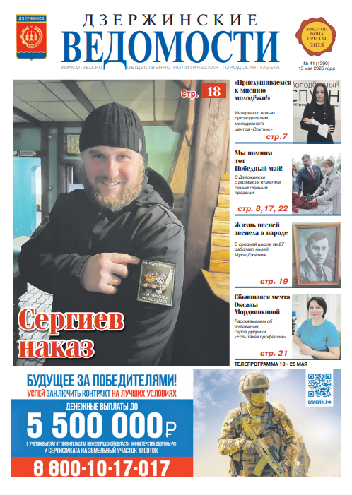 Более 37 тысяч жителей Дзержинска приняли участие в праздновании Дня Победы. Какие площадки стали самыми популярными, где угощали солдатской кашей, кто спел финальную песню «День Победы» – смотрите в подборке наших корреспондентов «Мы помним тот Победный май!». В молодежном центре «Спутник» под наставничеством креативных сотрудников творческие юноши и девушки проявляют свои таланты. А еще здесь с марта этого года новый руководитель – Наталья Шорохова. О ближайших планах и направлениях работы читайте на страницах газеты. Легко ли батюшке исповедовать бойцов? Что отвечать родителям, потерявшим на СВО сына? Как сохранить святыню для причастия? На эти вопросы корреспонденту газеты ответил протоирей Храма Всех Святых в Гороховце отец Сергий. Он окормляет бойцов, выполняющих свой долг в зоне проведения СВО, и привозит им гуманитарную помощь. В эту субботу, 17 мая, Дзержинск наполнит рёв моторов. По традиции в нашем городе соберутся байкеры со всего региона, чтобы открыть новый мотосезон. Под