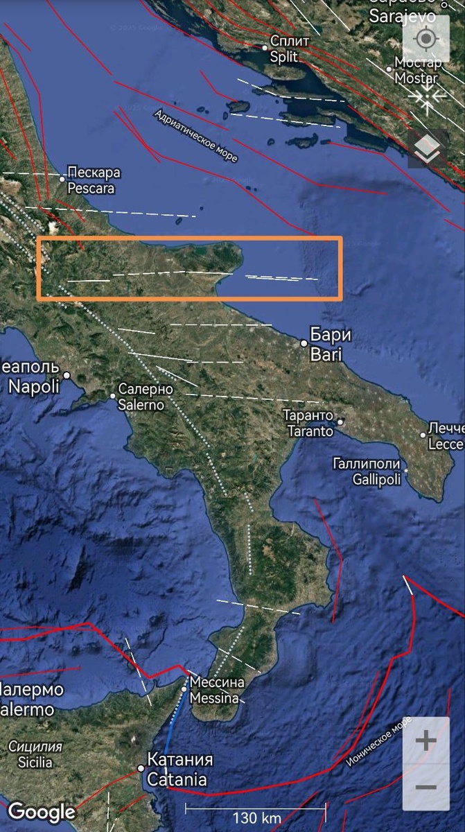 В юго-восточной части Италии есть вероятность землетрясения ~М5.5+/- в течение 9 дней. Помимо ОСТИ наблюдается неустойчивость Кельвина-Гельмгольца над Адриатическим морем. ===== In the southeastern part of Italy, there is a probability of an earthquake of ~M5.5+/- within 9 days. In addition to the CSTI, the Kelvin-Helmholtz instability is observed over the Adriatic Sea.