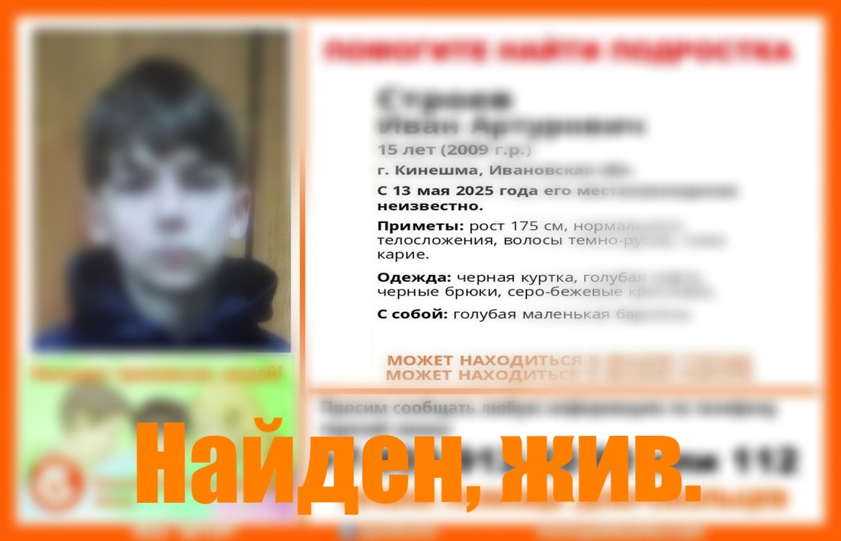 Пропал #Строев Иван Артурович, 15 лет, г. #Кинешма, #Ивановская обл. С 13 мая 2025 года его местонахождение неизвестно. Тема на сайте если у вас есть сведения, которые могут посодействовать поиску, Писать СЮДА Максимальный репост! Друзья, в свою очередь, мы очень просим, не будьте равнодушными, не проходите мимо. В случае обнаружения подростка звоните в 112. #берегите_себя_и_своих_близких_поисково_спасательный_отряд_artur Наши социальные сети и другие проекты отряда. Наш сайт Одноклассники Социальная сеть В Контакте Наш Telegram