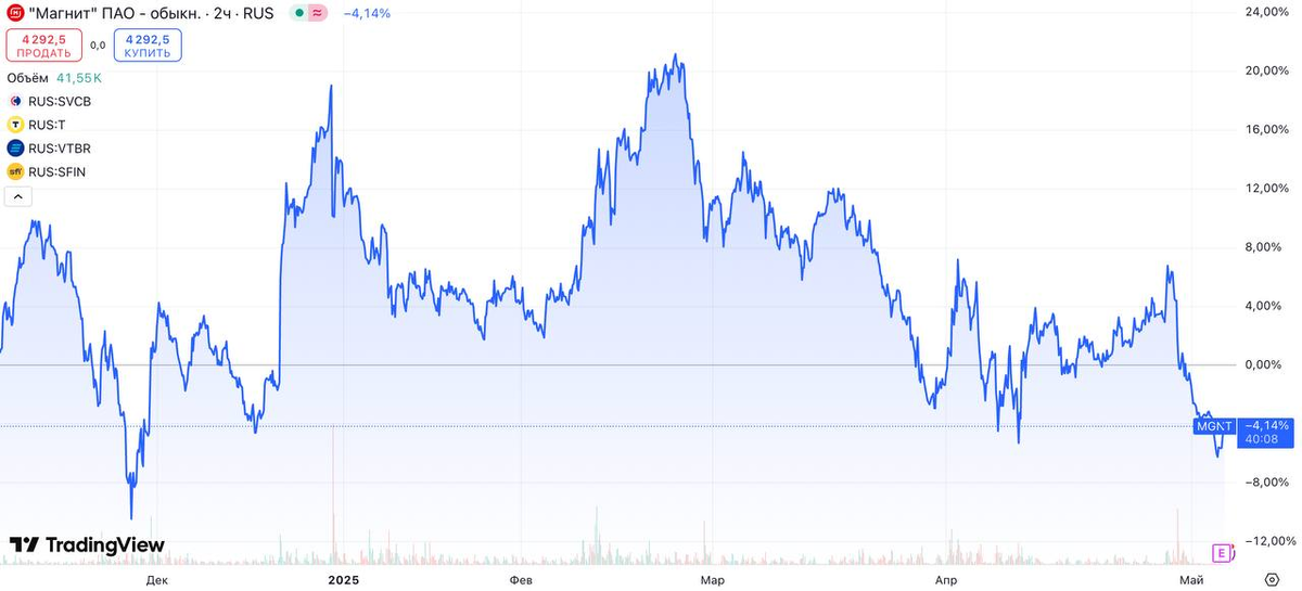 ❓ А что с долгом? Судя по цифрам Магнит выбирает стратегию агрессивного роста — возможно, пытается догнать Х5. — Чистый долг / EBITDA ≈ 1.5x — это ощутимая нагрузка. На проценты уходит ₽30–40 млрд в год. У X5 ситуация пока лучше. — Кап затраты ₽150 млрд + покупка «Азбуки Вкуса» (ещё ₽30–35 млрд). Вопрос: будут ли в таком сценарии дивиденды? Скорее всего, в результате долг вырастет, а соотношение Чистый долг/EBITDA может подобраться к 2.0x (если сделка состоится) — это уже рискованная зона. 📈 Посмотрим на мультипликаторы — P/E ~7x, EV/EBITDA ~3.2x — выглядит дешево, но это цифры с учетом казначейского пакета. — Если