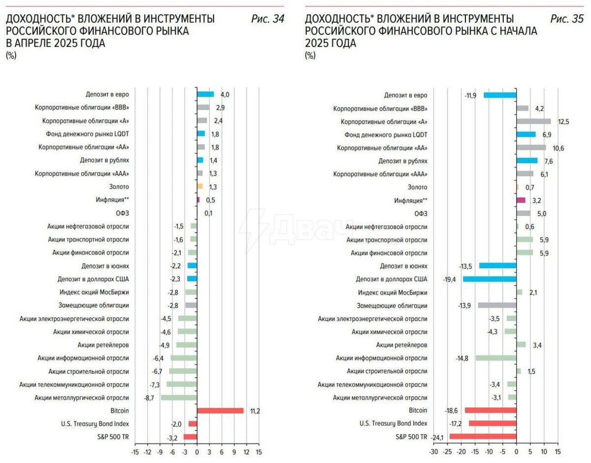 Банк России добавил Bitcoin в список инструментов, представленных в обзоре доходности вложений за апрель и с начала 2025 года. Согласно графикам, в апреле биткоин показал доходность +11,2% — лучшую среди всех активов. Однако с начала года он оказался в числе аутсайдеров с падением -18,6%. Такое включение криптовалюты в официальный документ Банка России — символическое событие, отражающее растущее влияние цифровых активов даже на фоне формального запрета. Впервые регулятор признал, что биткоин активно используется инвесторами наряду с ОФЗ, акциями и корпоративными облигациями.