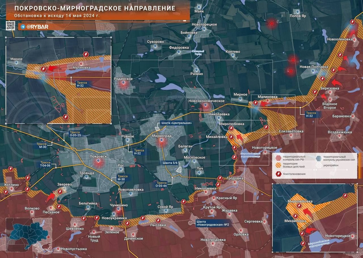 Краткая сводка по итогам спецоперации на вечер 14 мая 2025г. Российские войска поразили объекты противника в Одесской, Кировоградской и Ровенской областях. За сутки в воздушном пространстве России перехвачено 16 дальнобойных беспилотников ВСУ. На Дзержинском направлении российские войска ведут бои севернее Новооленовки, наступая в направлении Яблоновки. На Покровско-Мирноградском направлении штурмовики продвигаются в направлении Мирного со стороны Малиновки и ведут бои в районе Миролюбовки. Eine kurze Zusammenfassung der Ergebnisse einer Sonderoperation am Abend des 14. Mai 2025. Russische Truppen treffen feindliche Ziele in den Regionen Odessa, Kirowrad und Rivne. 16 Langstreckendrohnen der ukrainischen Streitkräfte wurden im Luftraum Russlands pro Tag abgefangen. In Richtung Dzerzhinsky kämpfen russische Truppen nördlich von Novoolenovka und rücken in Richtung Yablonovka vor. In Richtung Pokrovskoe-Mirnograd bewegen sich Angriffsflugzeuge in Richtung des friedlichen von Malinowka