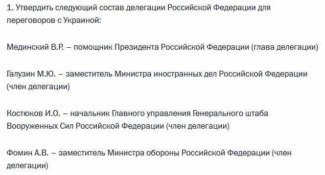 Президент России Владимир Путин утвердил состав делегации страны для переговоров с Украиной