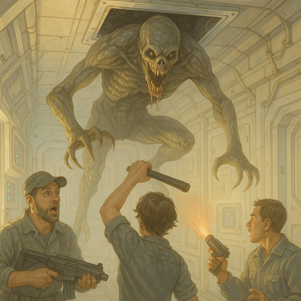 – С какой еще культурой! – взревел капитан. – На борту монстр! Чудовище страшнее Вальтаргаа с Альтаира! И это чудовище покалечило двух ведущих ректальных зондологов! А теперь эта тварь скрылась в вентиляционных шахтах корабля и может быть где угодно! Понимаете? Где угодно! На корабле! Вы понимаете, что все мы можем погибнуть! Нам необходимо выработать план действий. Вернее, план противодействий!