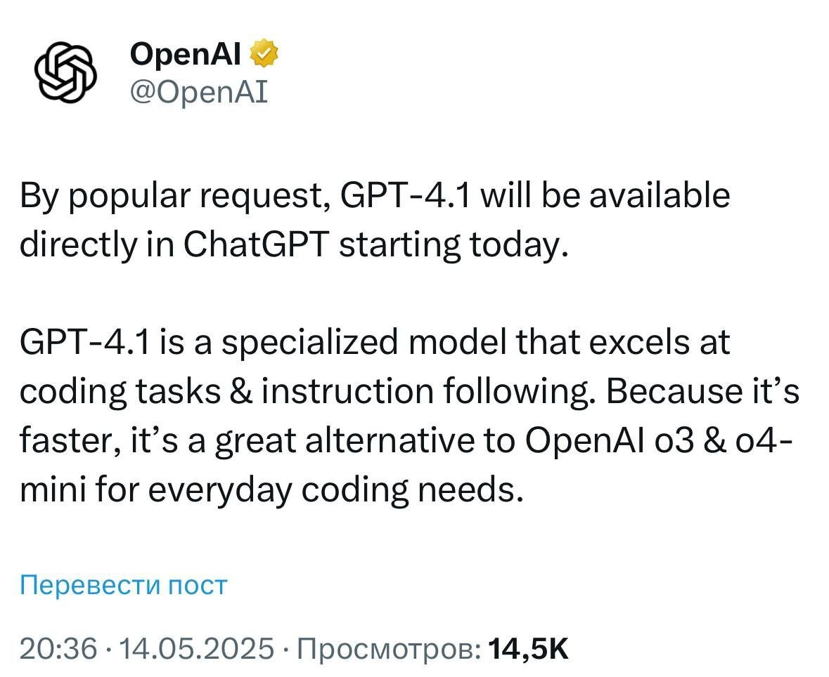 Объявлен выход GPT-4.1 в ChatGPT Новая модель демонстрирует значительное превосходство над GPT-4o в генерации кода и существенно опережает GPT-3 по скорости обработки запросов. Ключевое улучшение — расширенное контекстное окно, поддерживающее до 1 миллиона токенов. На текущий момент доступ к GPT-4.1 открыт исключительно для пользователей с платной подпиской. Обладатели бесплатного тарифа получат ограниченную версию — GPT-4.1-mini. Обновление продолжает внедряться — следите за новостями. AI Genom | Инструменты будущего уже здесь
