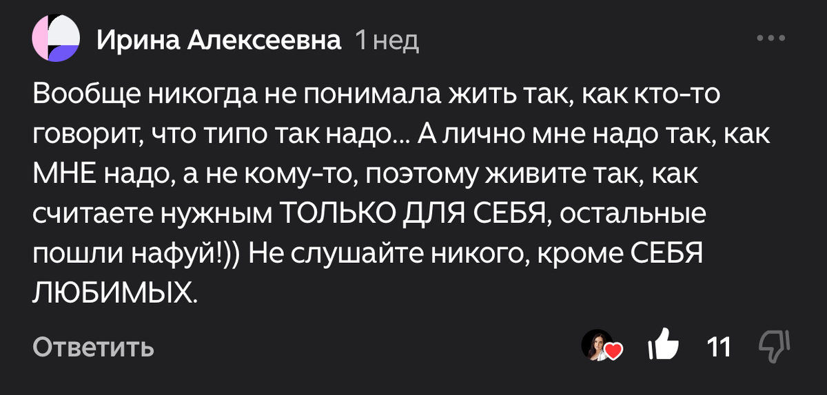 Отличный коммент есть в моей неожиданно завирусившейся статье: Если заменить слово «стандарты» на «ожидания», то суть раскрыть проще, хотя смысл останется прежним. — Хорошая жена? Галочка. — Заботливая мать? Стараюсь. — Внешне ухожена, эмоционально стабильна, не забываю про карьеру, готовлю полезную еду, интересуюсь развитием ребёнка, занимаюсь собой, не жалуюсь? Ну, хоть что-то из этого — да. А внутри — усталость. И вопрос: а я вообще кто без всего этого? Мне кажется, большинство женщин хотя бы раз чувствовали это: как будто ты не живёшь, а сдаёшь экзамены. Мы всё время сравниваем себя. С подругой. С блогершей. С мамой. С соседкой, у которой «и трое детей, и бизнес, и сама себе парикмахер». И всё время чувствуем: чего-то не хватает. Где-то я снова не дотянула. И большинство с азартом включается в эту гонку до полного изнеможения. Почему? Да просто потому, что нас не учили смотреть внутрь, опираться на себя, чувствовать свою норму — нас учили смотреть на других и стараться быт