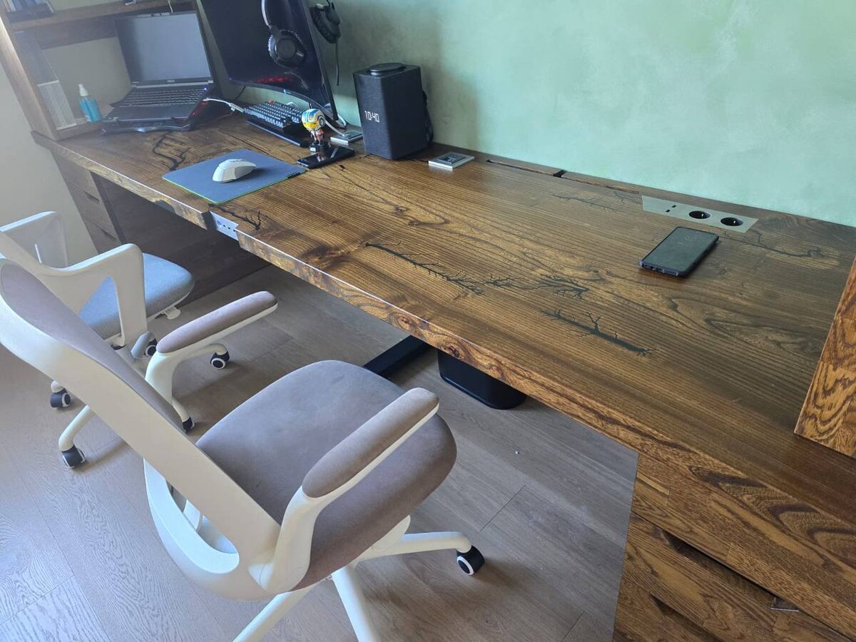 Иногда нас спрашивают: «А можно ли без подъёмных ножек, но с характером, с мощью, с деревом, чтобы всерьёз и надолго?» Можно. И мы сделали. Перед вами — трёхметровый умный стол из слэба карагача, стоящий на двух массивных дубовых тумбах. Для двух человек. Работать, играть, собирать сетап — вдвоём и с комфортом. Слэб, молнии и никакой эпоксидной “реки” Дерево было шикарным само по себе. Карагач — со своим характером, текстурой, тяжестью. Поэтому от идеи эпоксидной реки отказались. Но добавили огня — в прямом смысле. Мы пустили по столешнице молнии Лихтенберга — это когда высокое напряжение прожигает дерево и оставляет узоры в виде настоящих разветвлённых молний. Потом залили эти участки прозрачной эпоксидкой — получилось эффектно и долговечно. Брутальность с начинкой: встроенные технологии Внутри этого зверя — всё, что нужно современному человеку: • Встроенные Bluetooth-колонки 60 Вт с тёплым звуком и дубовым корпусом • RGB-подсветка, чтобы на столе всегда был нужный вайб • Дв