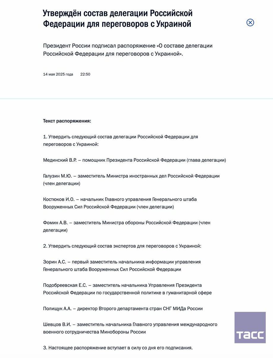 В ответ на пост 📃 Путин утвердил состав российской делегации для переговоров с Украиной, сообщает Кремль. В состав делегации войдут: ▪️Мединский В.Р. – помощник президента РФ (глава делегации); ▪️Галузин М.Ю. – замминистра иностранных дел РФ (член делегации); ▪️Костюков И.О. – начальник ГУ ГШ ВС РФ (член делегации); ▪️Фомин А.В. – замминистра обороны РФ (член делегации); Утверждён также состав экспертов для переговоров с Украиной: ▪️Зорин А.С. – первый замначальника информации управления ГШ ВС РФ; ▪️Подобреевская E.C. – замначальника управления президента РФ по государственной политике в гуманитарной сфере; ▪️Полищук А.А. – директор второго департамента стран СНГ МИД РФ; ▪️Шевцов В.И. – замначальника главного управления международного военного сотрудничества МО РФ.