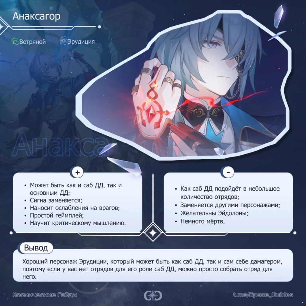 ㅤВо второй половине версии 3.2 доступен новый персонаж — Анаксагор, а вместе с ним и вернулся реран Доктора Рацио. Это персонажи разных специализаций, но Анакса, как и Рацио, тоже может выполнять роль основного дамагера. Они отличаются количеством целей и типом урона. ㅤЕсли вы ещё не успели определиться, кого из героев вам стоит выкрутить, эта статья поможет вам сделать выбор~. ㅤЭто новый персонаж Ветряного типа, следующий Пути Эрудиции. Он может выполнять как роль саб ДД, в отряде, например, с Гертой, а может быть и самостоятельным дамагером, вокруг которого собирается отряд. Его сборка зависит от роли в отряде. ㅤЕсли он саб ДД, то важнее набирать больше скорости, чтобы чаще накладывать ослабления. Из-за этого могут проседать сила атаки и криты, но в этой роли от него нужно не так много урона. ㅤЕсли же он основной дамагер, то важнее набирать силу атаки и криты. ㅤВ любой роли он может накладывать все типы ослаблений на всех врагов, что обеспечит комфортный геймплей против любых врагов.