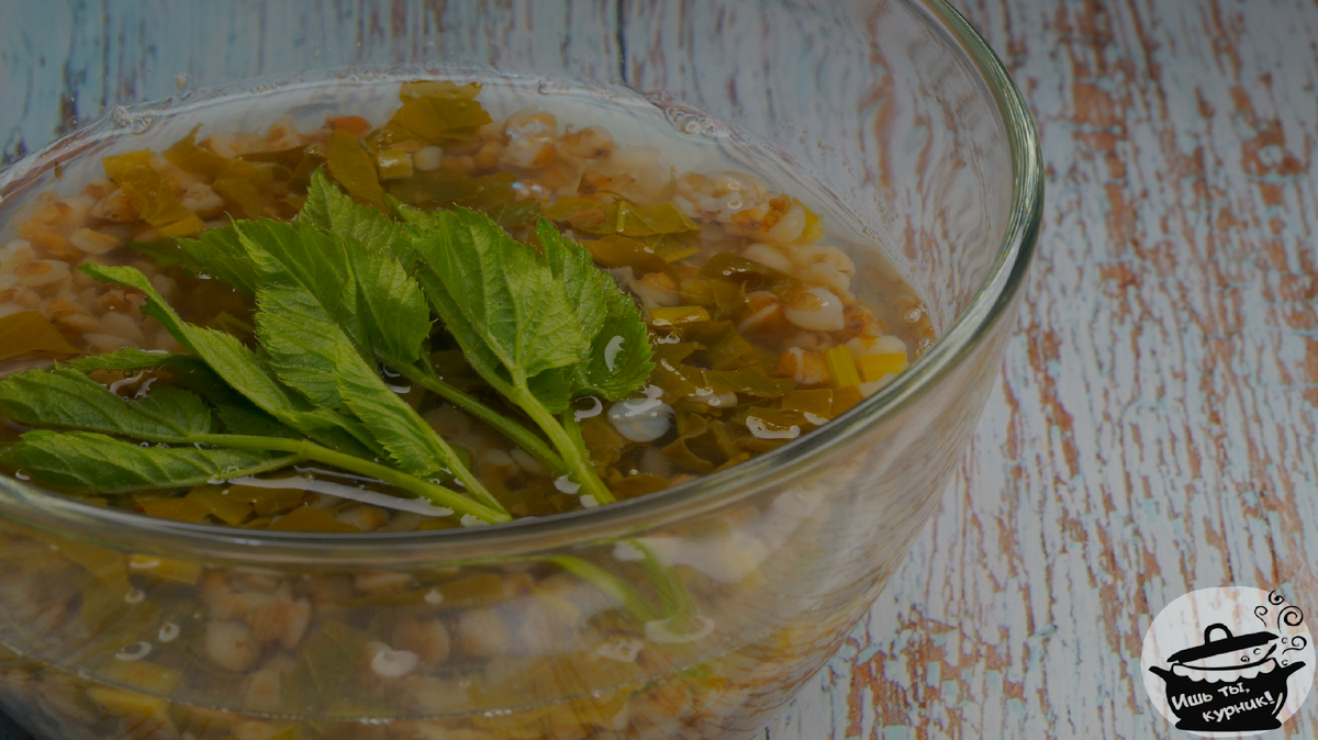 морковь потереть на мелкой терке. Щавель и сныть тщательно промыть, порезать тонко. В кипяток опустить лавровый лист, перец, зелень, варить 2 минуты, затем добавить гречку и морковь, варить еще 20 минут.
