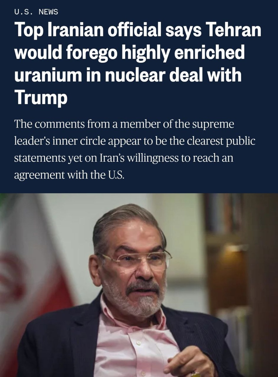 Khamenei's advisor says Iran would AGREE to Trump nuke deal with these conditions: — Iran commits to never making nukes — Scraps highly-enriched uranium — Allows international inspectors to supervise enrichment In exchange for IMMEDIATE lifting of ALL US sanctions, Ali Shamkhani tells NBC. #Iran #US