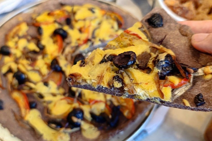 Пицца для всех: когда тесто не хочет быть главным героем 🍕✨ Почему она крута? ▫️ Тайный ингредиент — свобода: можно есть и не вспоминать про тяжесть в животе после обеда. ▫️ Тесто-невидимка: оно так старается быть незаметным, что вы сосредоточитесь на самом важном —соусе, томатах и маслинах, которые явно заслужили Оскар за роль «идеальной начинки». Понадобится: Основа, на 2 пиццы диаметром 25-28 см ✔️Мука из зеленой гречки 280 гр ✔️Вода 150 гр ✔️Соль 1/2 ч.л. ✔️Растительное масло 40 гр, у меня горчичное Приготовление: Смешать муку зеленой гречки с солью Добавитьводу и масло, замешать пластичное тесто Застелить форму пергаментом и обильно смазать маслом. Я смазала кокосовым, но можно использовать масло авокадо или горчичное Раскатать основу нужной формы . Толщина ~4-5мм Далее готовим начинку Она может быть любой по вашему вкусу. Что использовала я: ✔️лук репчатый ✔️маслины ✔️вешенки ✔️томат ✔️тофу-соус Приготовление: Режем произвольно лук Укладываем нарезанный томат и половинк