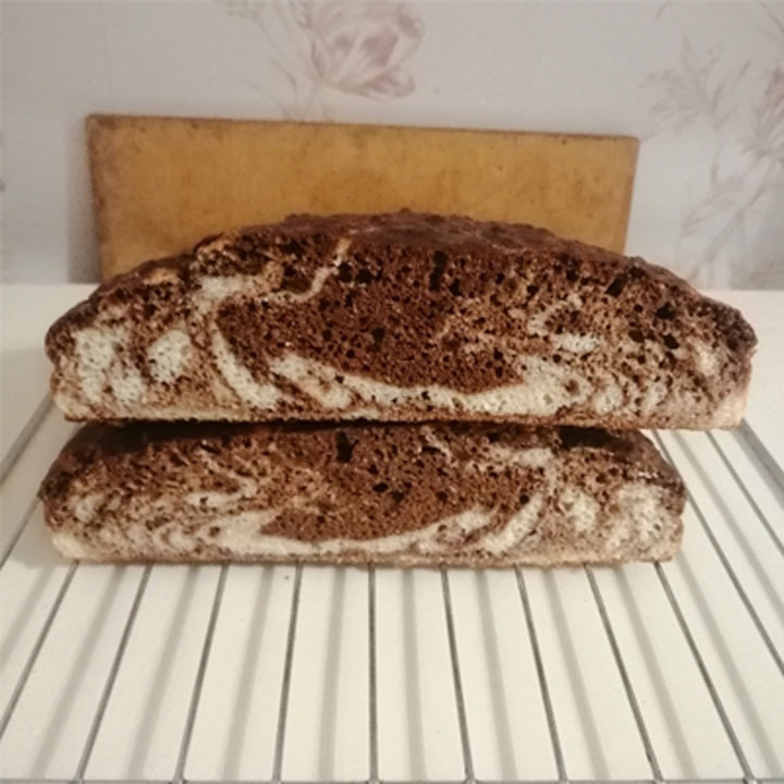 ✔ 250 г йогурта; ✔ 4 яйца; ✔ 50 г овсяной муки; ✔ 50 г миндальной муки; ✔ 20 г кокосовой муки; ✔ 20 г какао; ✔ 10 г разрыхлителя; ✔ Соль, сахарозаменитель - по вкусу. Йогурт, яйца, миндальную муку, овсяную муку, соль, сахарозаменитель смешать. Разделить массу на две одинаковые части. В первую часть («белая» масса) добавляем кокосовую муку и 5 г разрыхлителя. Во вторую часть («тёмная» масса) - какао и 5 г разрыхлителя. Если «белая» масса будет слишком густой, надо добавить йогурт, столько, чтобы обе массы были одинаковые по густоте. В форму (18 см) выкладываем ложкой, начиная от центра, поочерёдно обе массы. Выпекаем при 180 градусах примерно 50 минут. Проверяем шпажкой. КБЖУ на 100 г - 206/13,9/12,0/12,8. Рецепт на странице Автор рецепта – Татьяна Симакова Расчёт КБЖУ сделан с помощью Telegram-чат-бота https://t.me/vesipitaniebot © Почтенный возраст Online и Рецепты для диабетиков