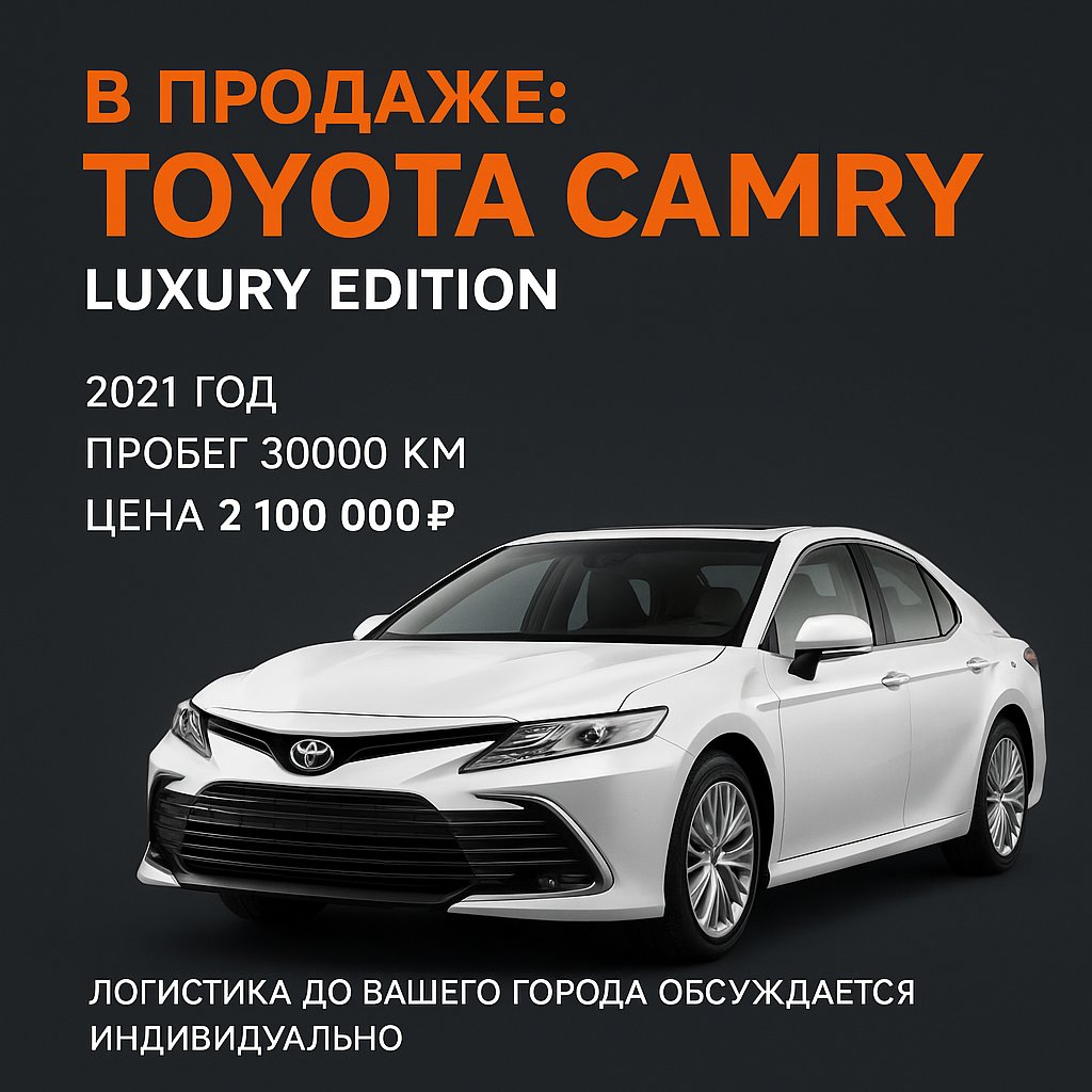 Toyota Camry давно стала символом надёжности, комфорта и респектабельного стиля. Версия 2021 года в комплектации Luxury Edition — это современный седан бизнес-класса с максимальным уровнем оснащения, премиальной отделкой и сбалансированной динамикой. Компания WEICARSAUTO предлагает вам приобрести проверенную Toyota Camry с пробегом всего 30 000 км, в отличном состоянии, с доставкой «под ключ» до Уссурийска, а также возможностью доставки в любой город России по индивидуальной договорённости. 📅 Год выпуска: 2021