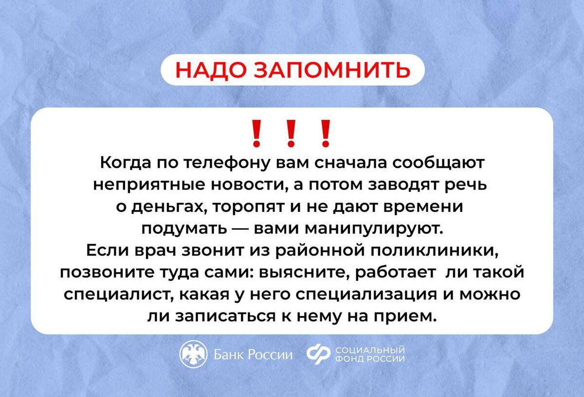 ⚠️Отделение Социального фонда России по Тюменской области призывает граждан проявлять бдительность и не поддаваться на уловки мошенников! Вместе с Банком России рассказываем о популярных схемах мошенничества. Помните правила финансовой безопасности: ❌ Не разговаривайте с посторонними о деньгах, даже если собеседник уверяет, что он из полиции, соцзащиты, поликлиники, банка или Центробанка ❌ Не передавайте данные своей карты и проверяйте сайты, прежде чем ввести свои данные там ❌ Не сообщайте по телефону пароли и коды, которые присылают банки, мобильные операторы или Госуслуги 👀 Всегда проверяйте информацию и перезванивайте в ведомства по номеру с официального сайта. Берегите себя и позаботьтесь, чтобы ваши близкие не стали жертвами обмана ❤️ #ПравилаБезопасности #СФР